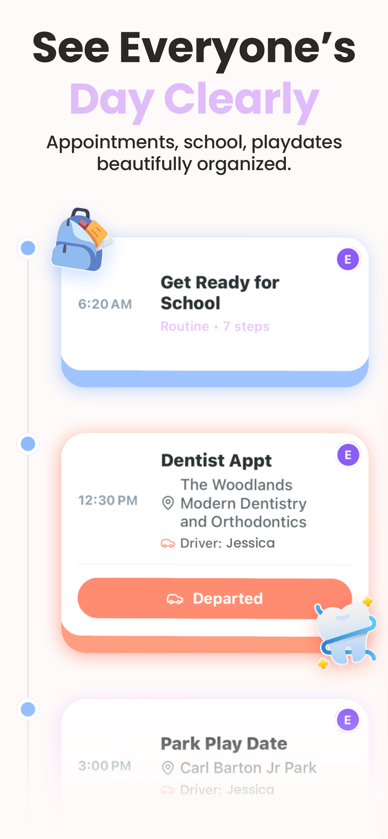 Appointments, school, playdates. Beautifully organized with driver assignments, locations, and arrival status.